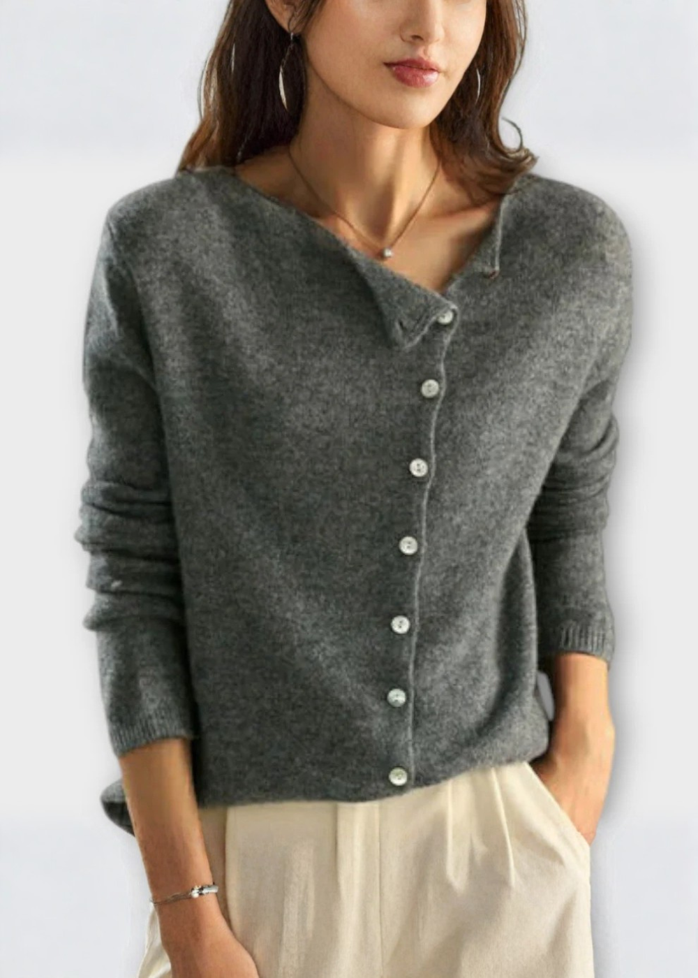 Asymetryczny design: Asymetryczne zapięcie na guziki nadaje temu klasycznemu kardiganowi nowoczesny akcent.