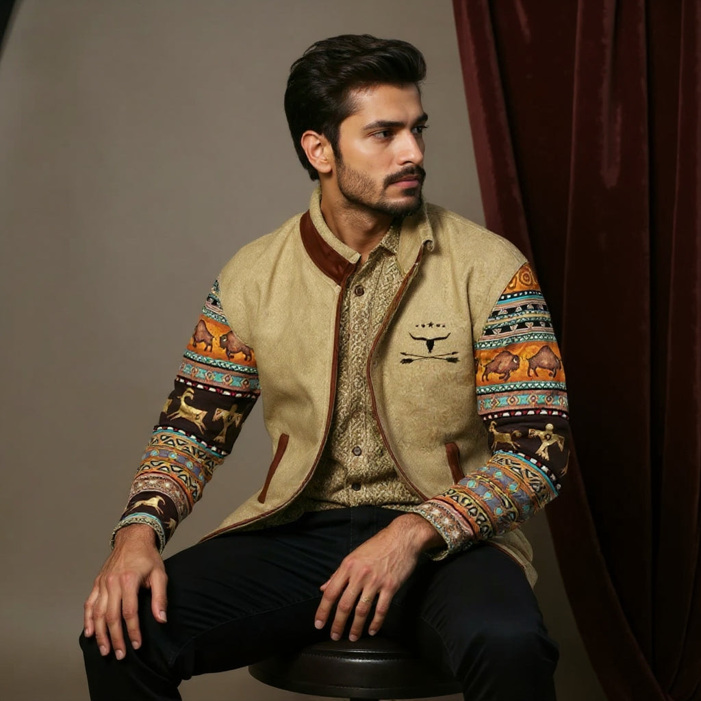 Artystyczny Design Ethno: Unikalne motywy na rękawach i piersi nawiązują do plemiennych tradycji i zewu natury. To detale, które przyciągają wzrok i nadają Twojej stylizacji głębi oraz autentyczności.